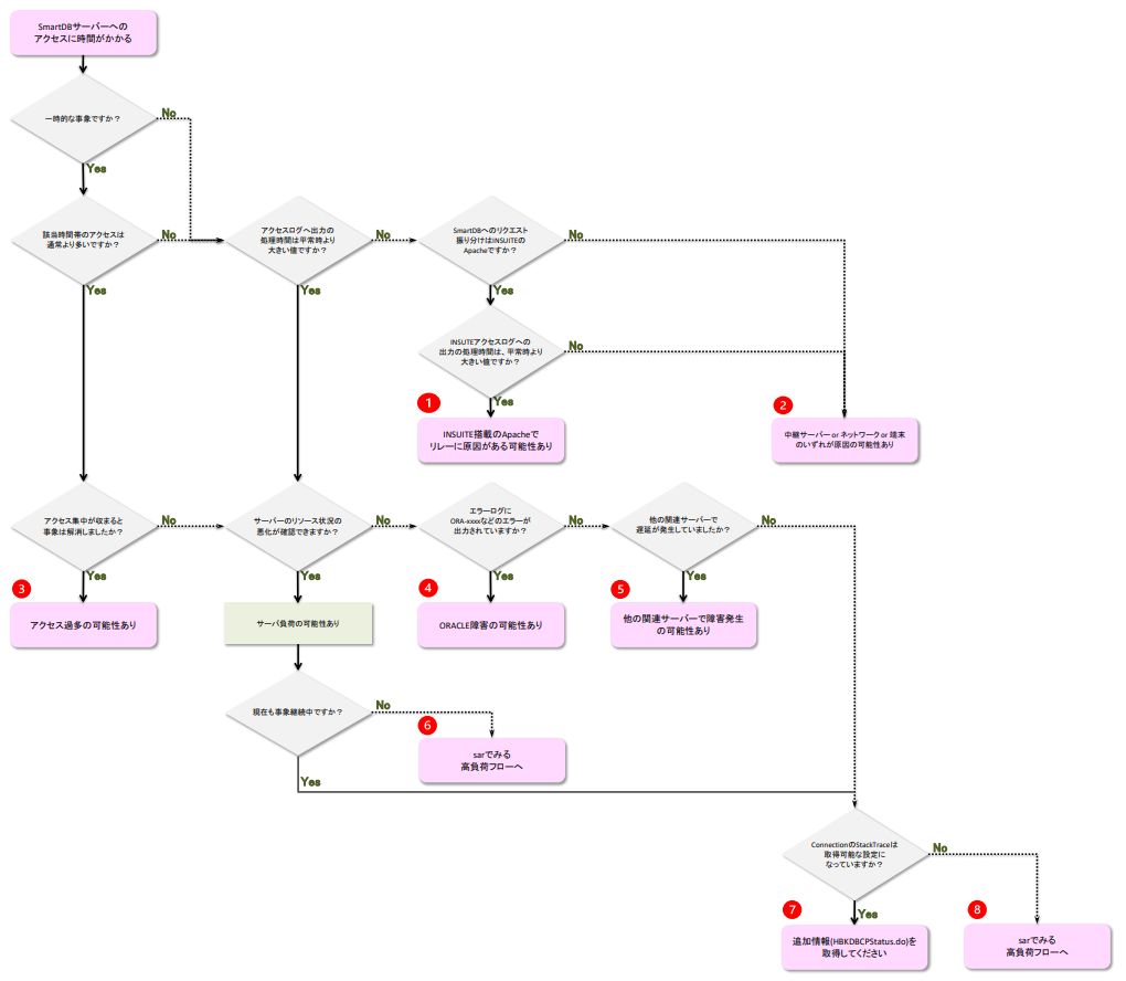 SmartDBにアクセスしても反応が遅い、画面が表示されにくいなど、次の「障害切り分けフロー」を参考に障害の原因がどこにあるか確認しましょう。